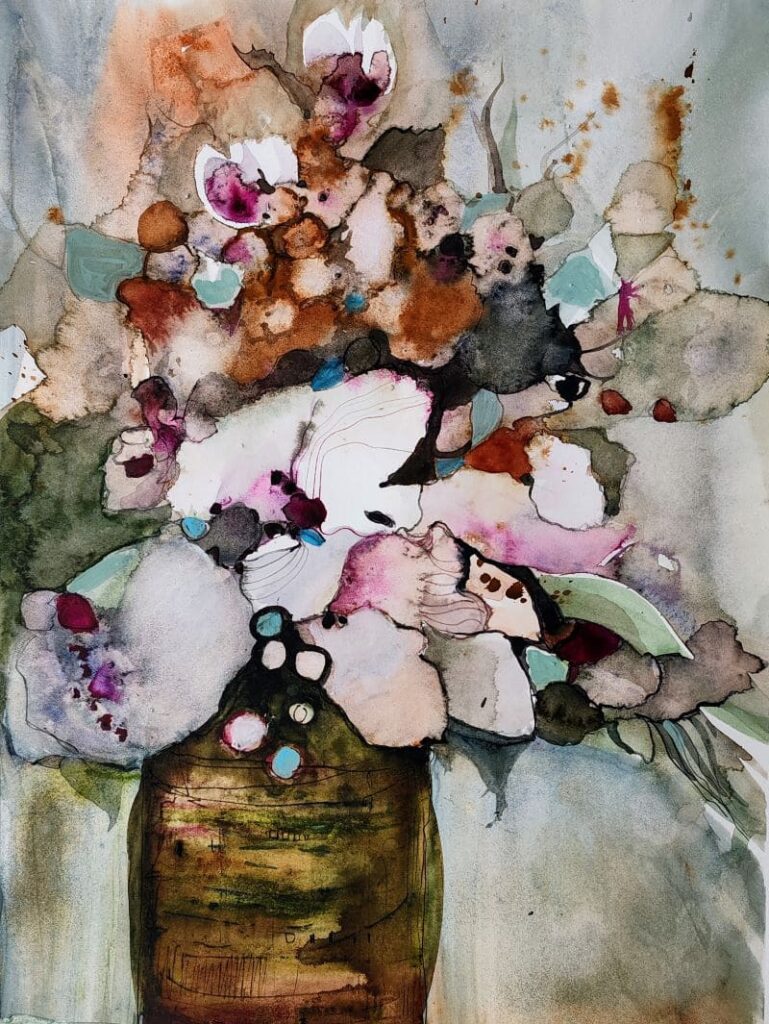 Neue Malerei entsteht oft in Serien, denn während des Malprozesses kommen ständig weitere Ideen zum Thema, hier im Beispiel Blumenaquarelle. Varianten zu Farbschemen, das Einbinden von Elementen, wie Gegenstände, oder auch Muster, sind unerschöpflich in ihrer Vielfalt. Solche Phasen sollte man ausnutzen und sind in meiner Malerei äußerst produktiv. Wird der Malflow erstmal unterbrochen, dann versiegt die Freude erstmal. Wir sind alle schnell abgelenkt von Dingen im Alltag.